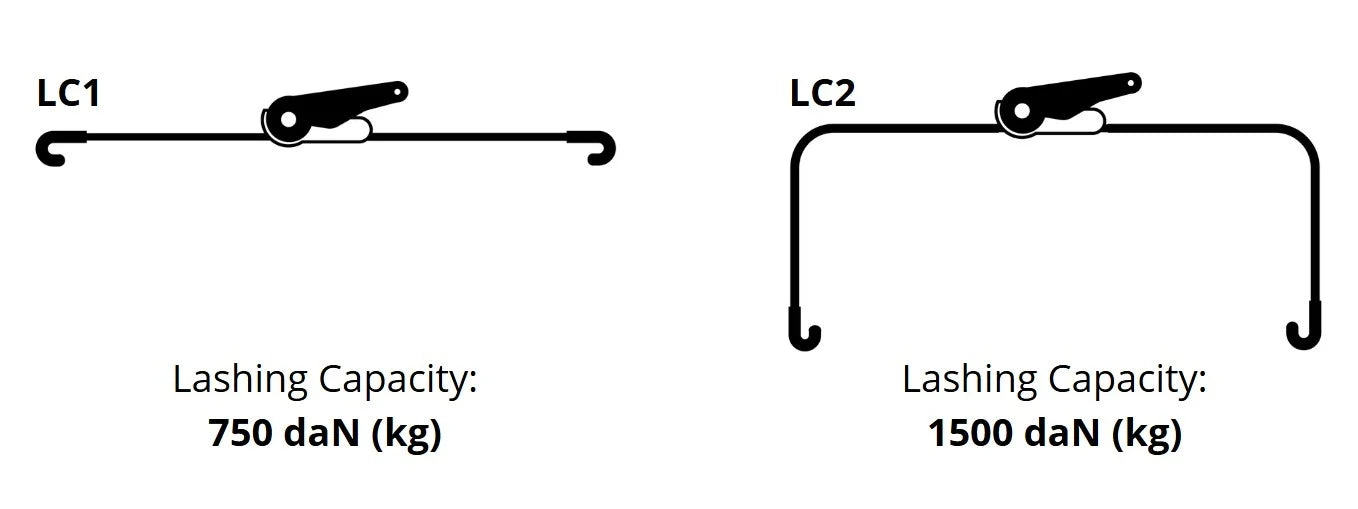LC1 correspond à la résistance à la rupture lors du serrage direct, où la charge est fixée sans appuyer contre le plancher de chargement. LC2 correspond à la résistance à la rupture lors de l’arrimage, où la charge est pressée contre le plancher de chargement pour une stabilité supplémentaire.