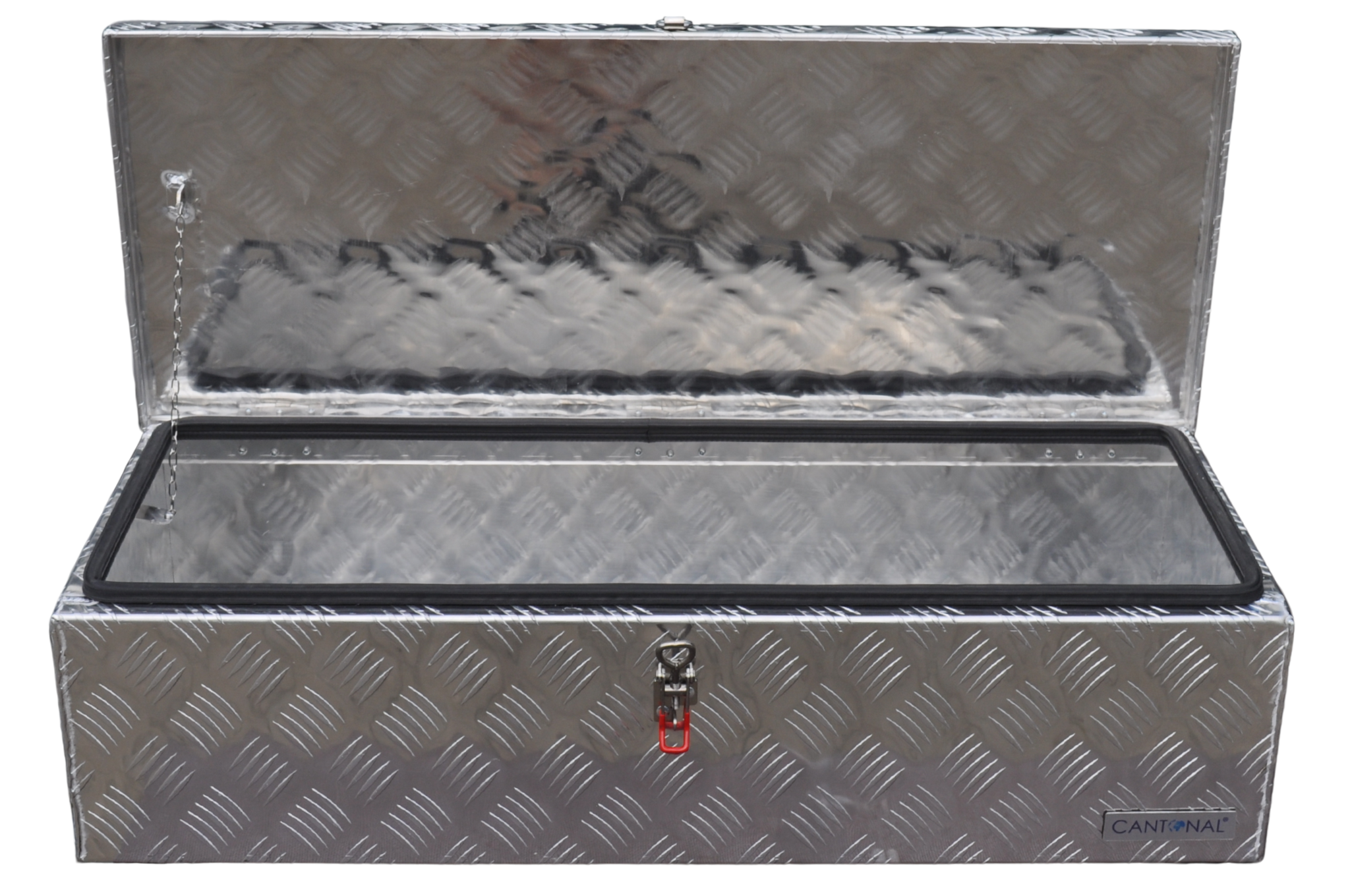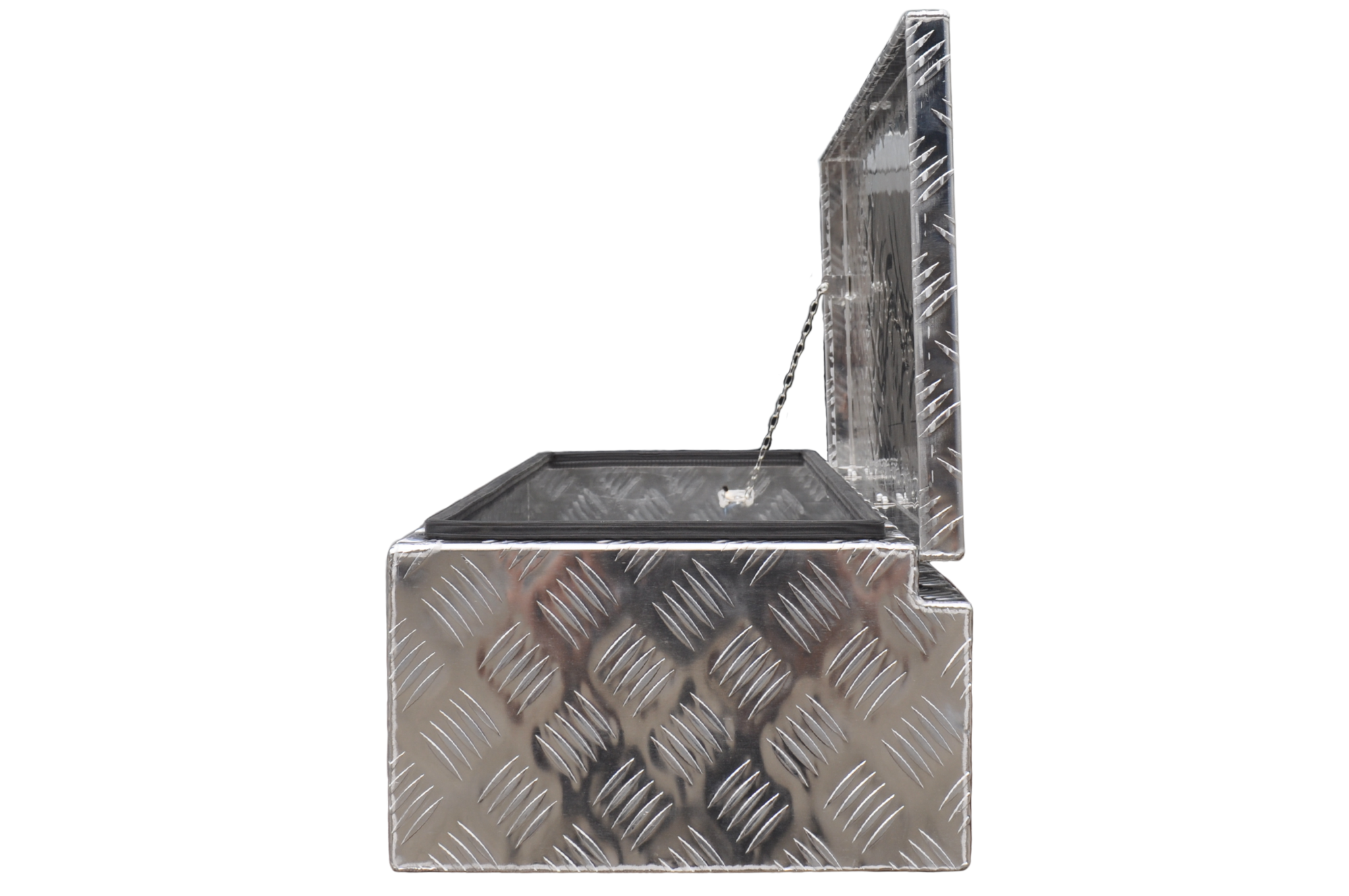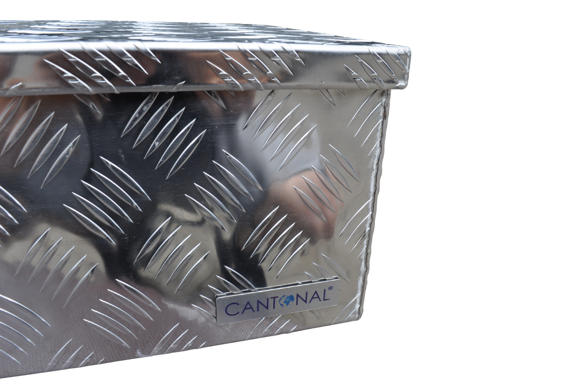 Ce coffre de timon en tôle aluminium à damier est parfait pour transporter en toute sécurité des outils ou des pièces détachées, par exemple sur une remorque. Grâce au joint en caoutchouc, le couvercle se ferme en douceur, sans vibrations, et recouvre proprement le coffre. Cela offre une bonne protection contre les éclaboussures.