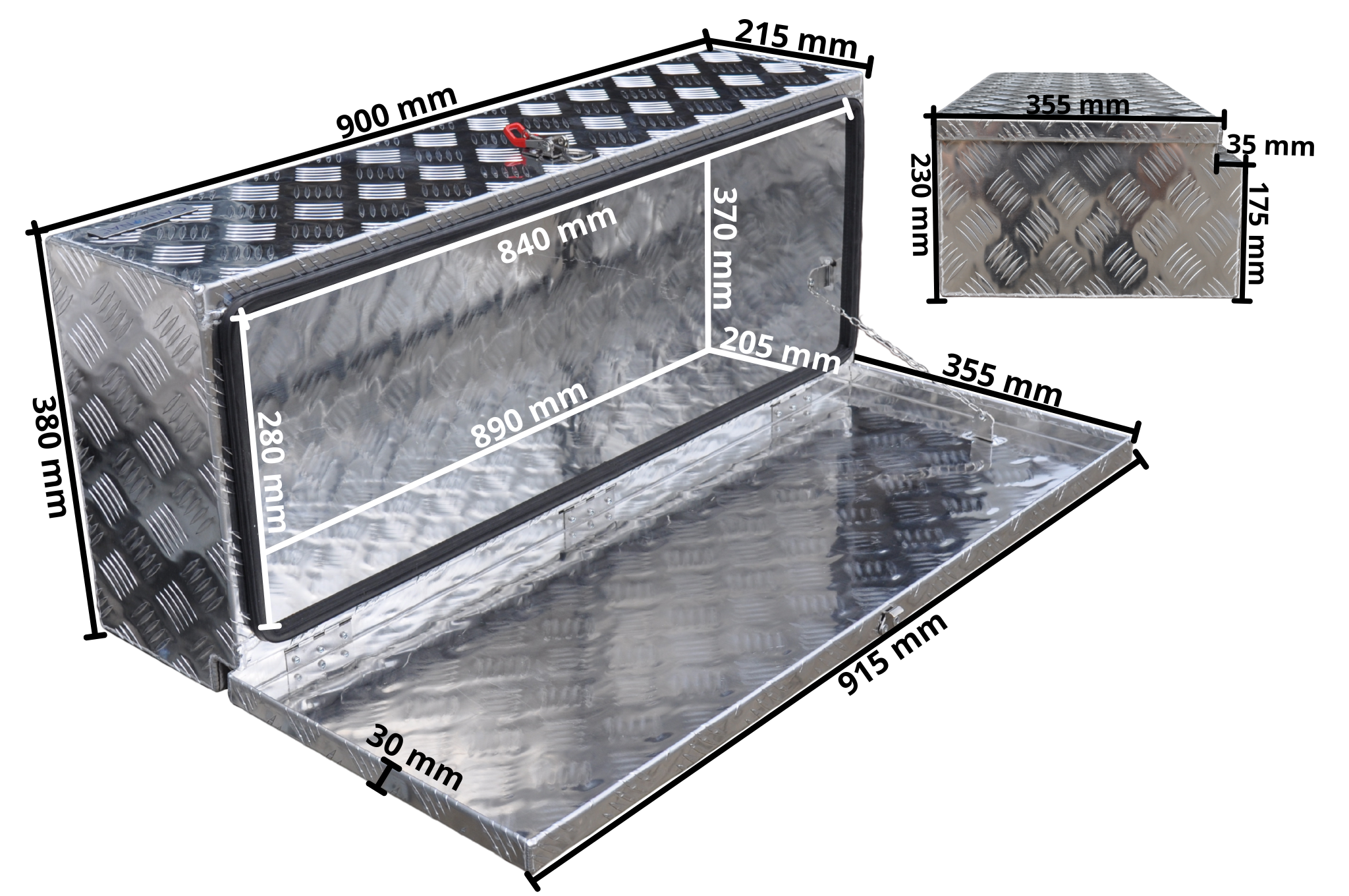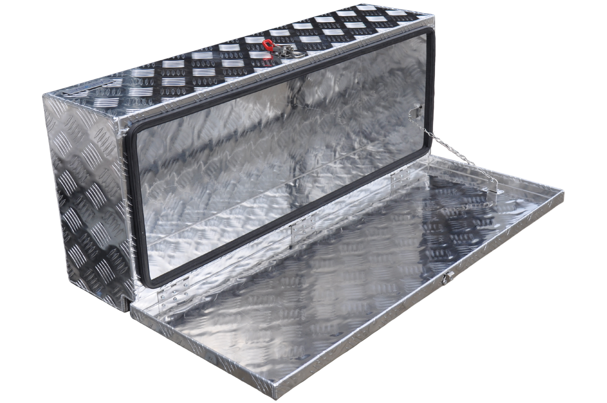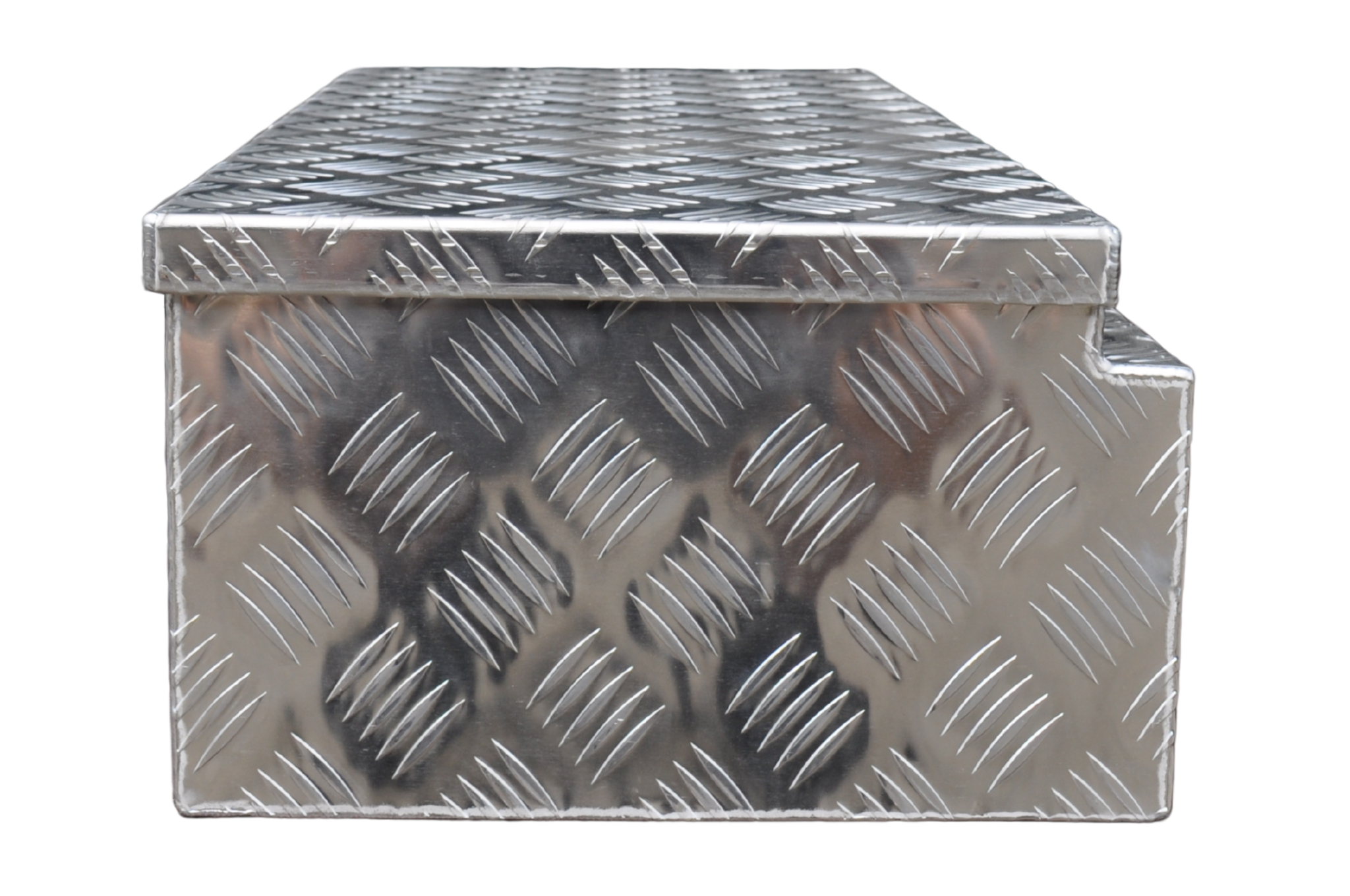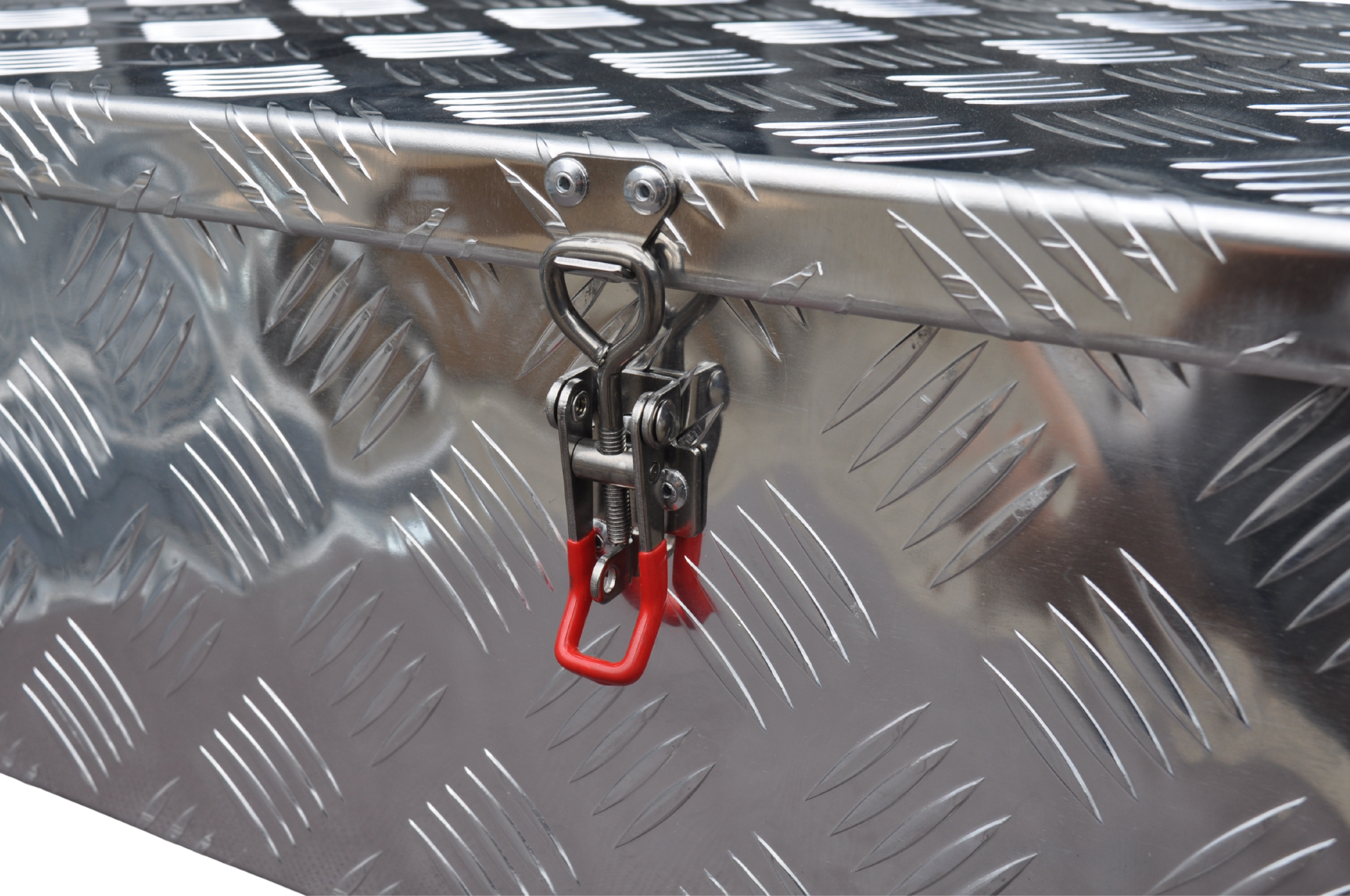 Ce coffre de timon en tôle aluminium à damier est parfait pour transporter en toute sécurité des outils ou des pièces détachées, par exemple sur une remorque. Grâce au joint en caoutchouc, le couvercle se ferme en douceur, sans vibrations, et recouvre proprement le coffre. Cela offre une bonne protection contre les éclaboussures.