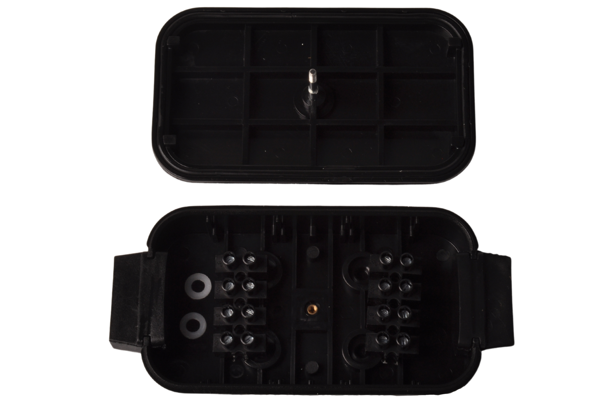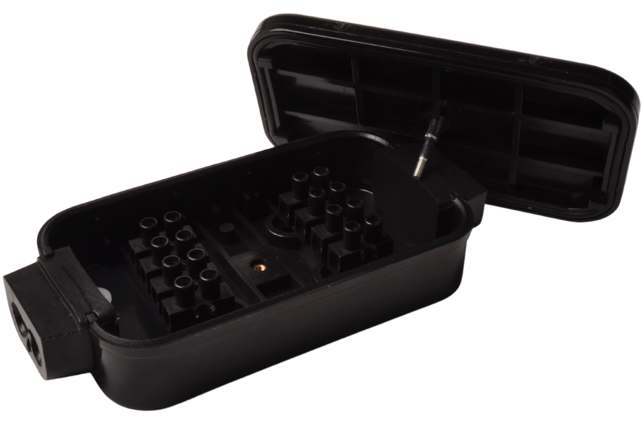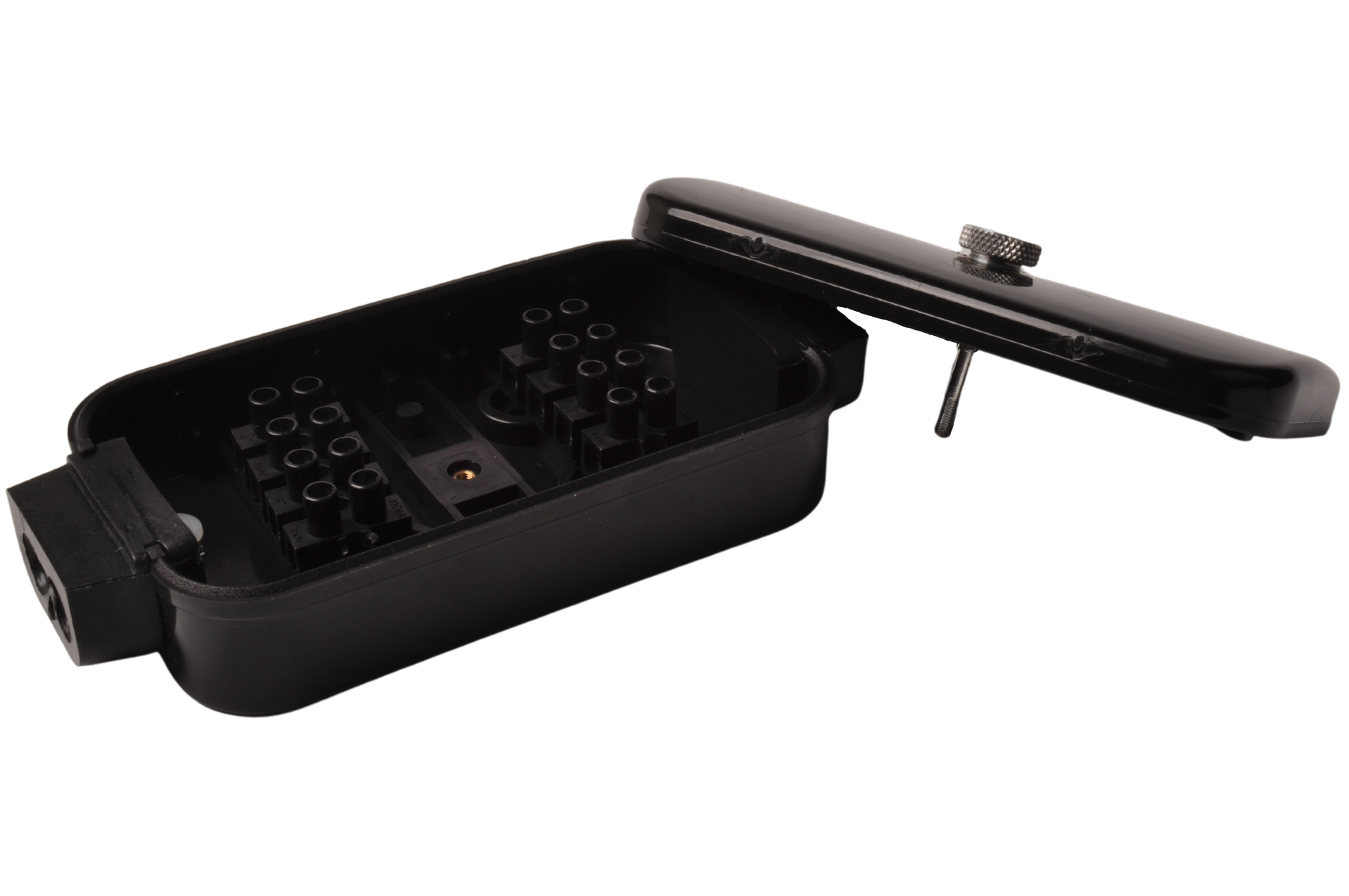 Avec un seul joint en caoutchouc et une construction extra-résistante pour une utilisation à long terme et un bornier à couronne à 8 pôles. Le couvercle se fixe sur la boîte à l'aide d'une vis centrale. Idéal comme boîte de jonction pour les remorques.