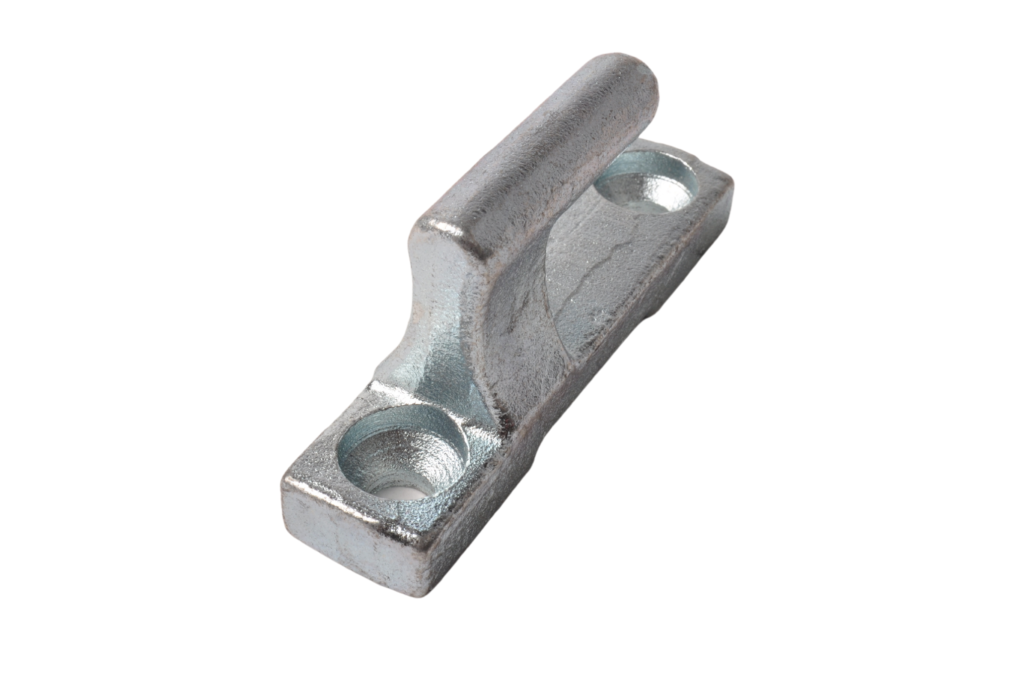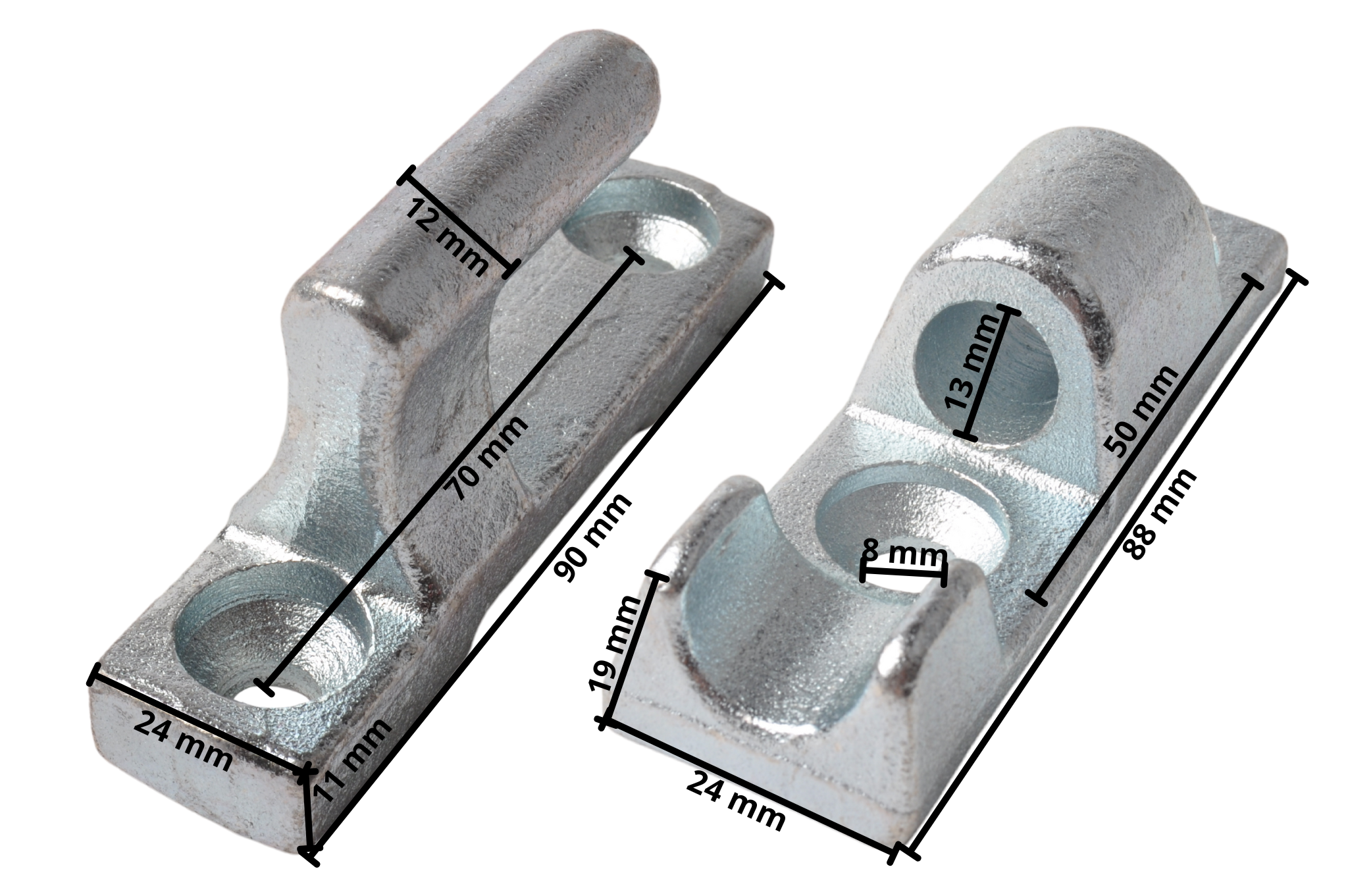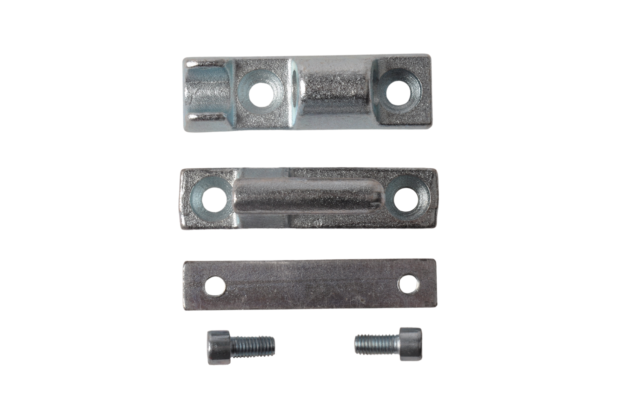 Charnière de paroi latérale complète TIR avec plaque de base et 2 vis à tête fraisée M8. Longueur totale de 90 mm.