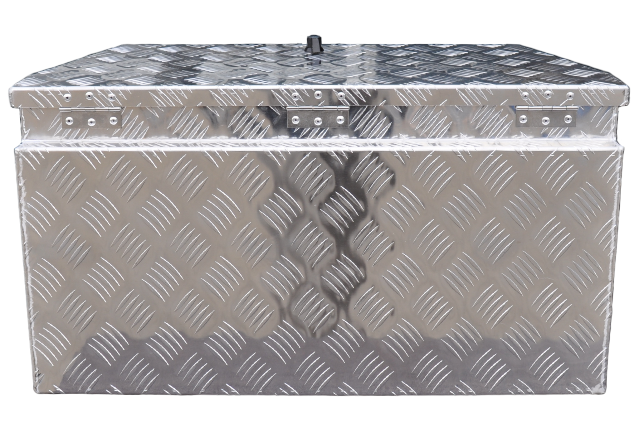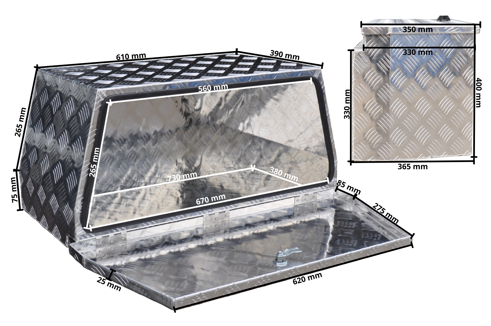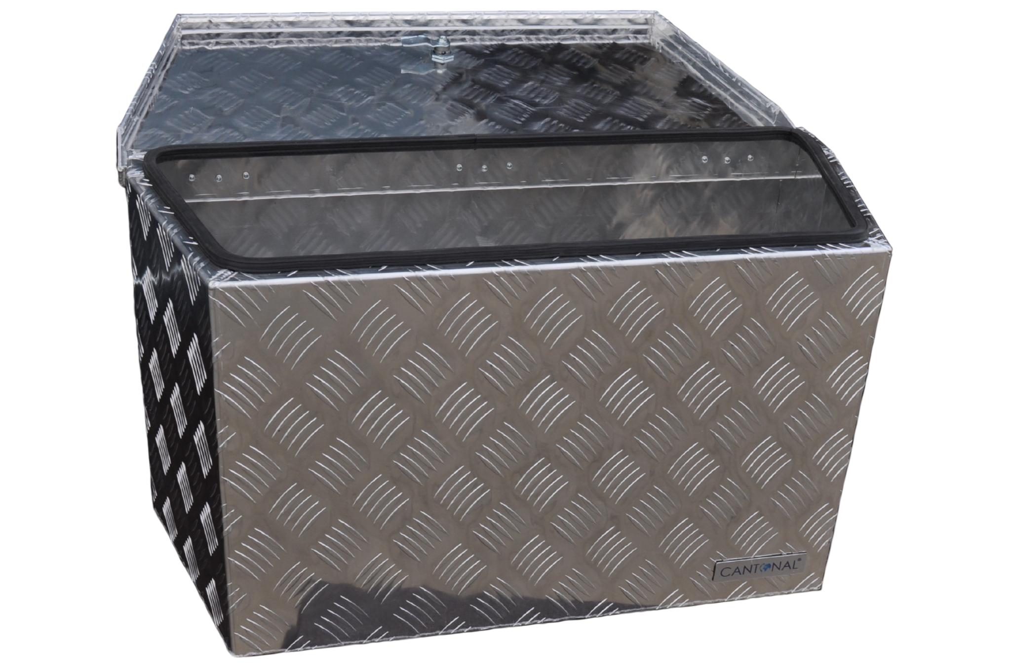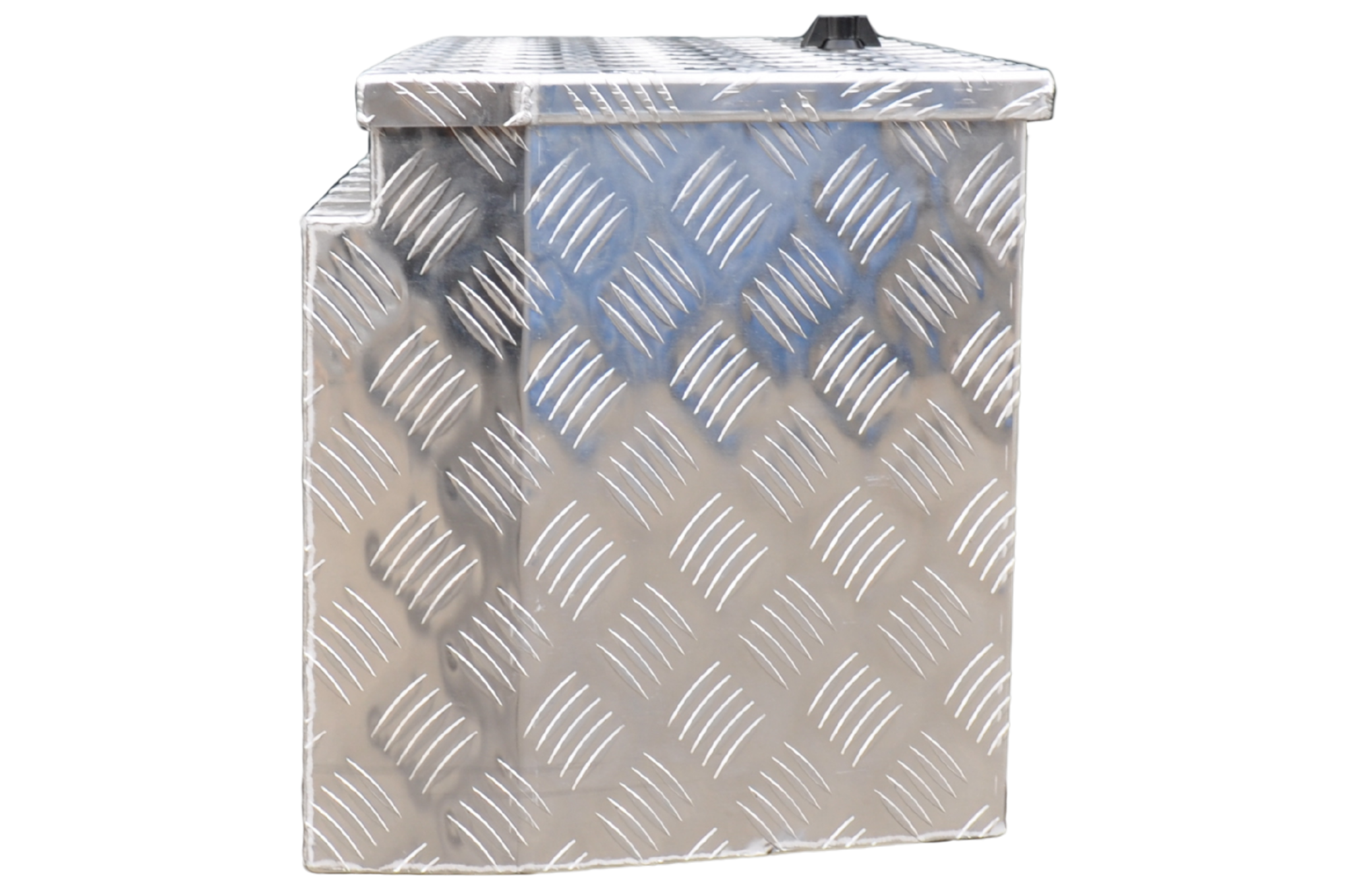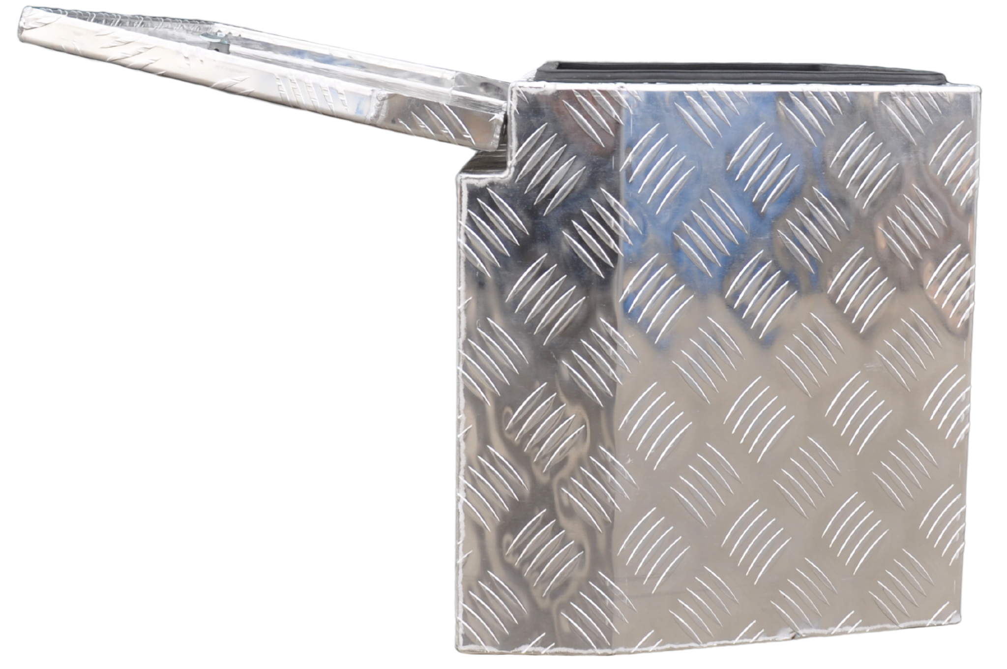 Ce modèle possède des côtés inclinés et une épaisseur de 2,5 mm. Le couvercle est légèrement en retrait pour ne pas heurter la ridelle lors de l’ouverture. Un joint en caoutchouc est fixé sur le rebord pour garantir une protection contre l’eau et la poussière (IP55). Le coffre pèse 11,3 kg et offre un volume de 115 litres. Il est équipé d’une serrure papillon pratique.