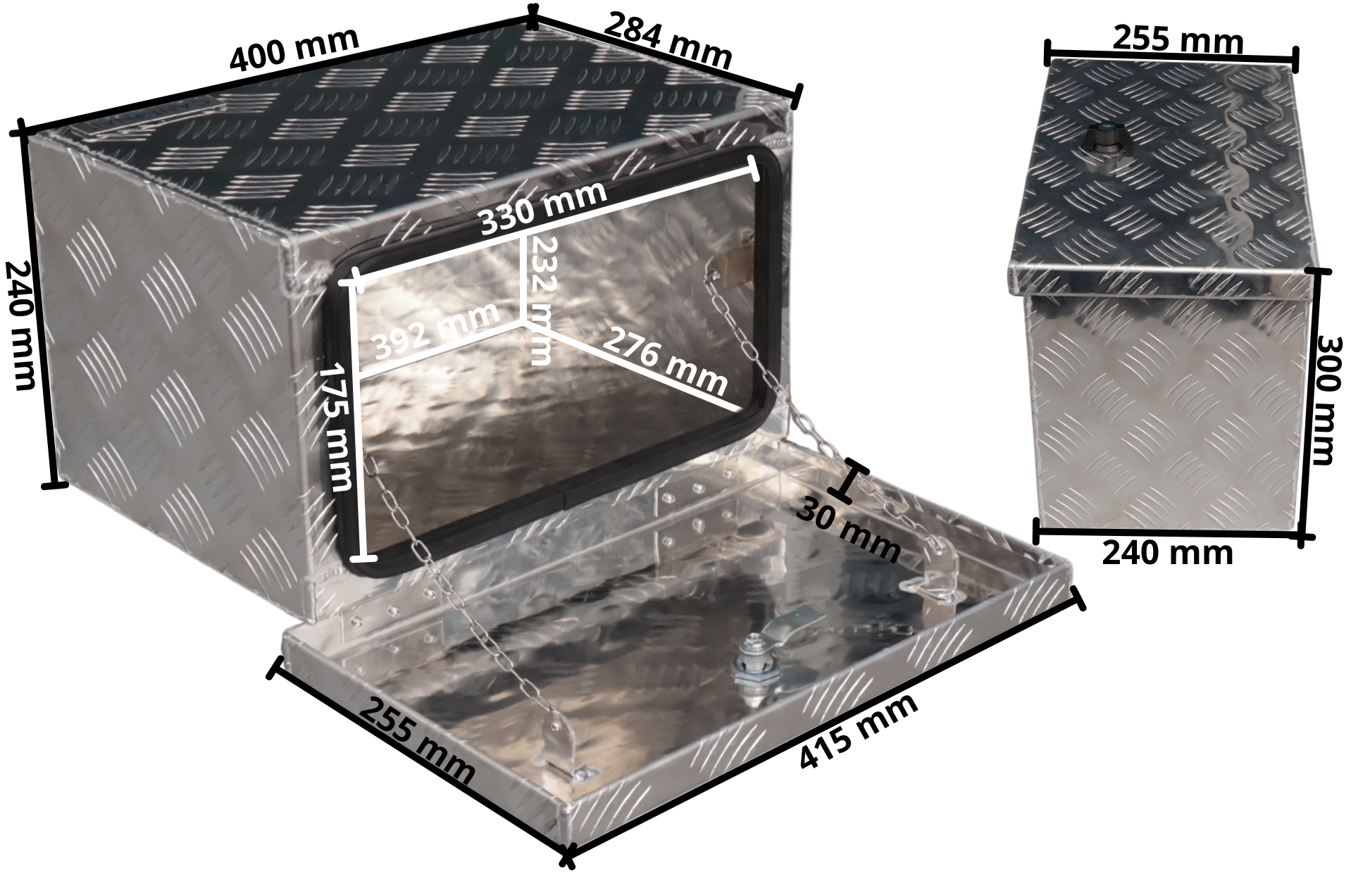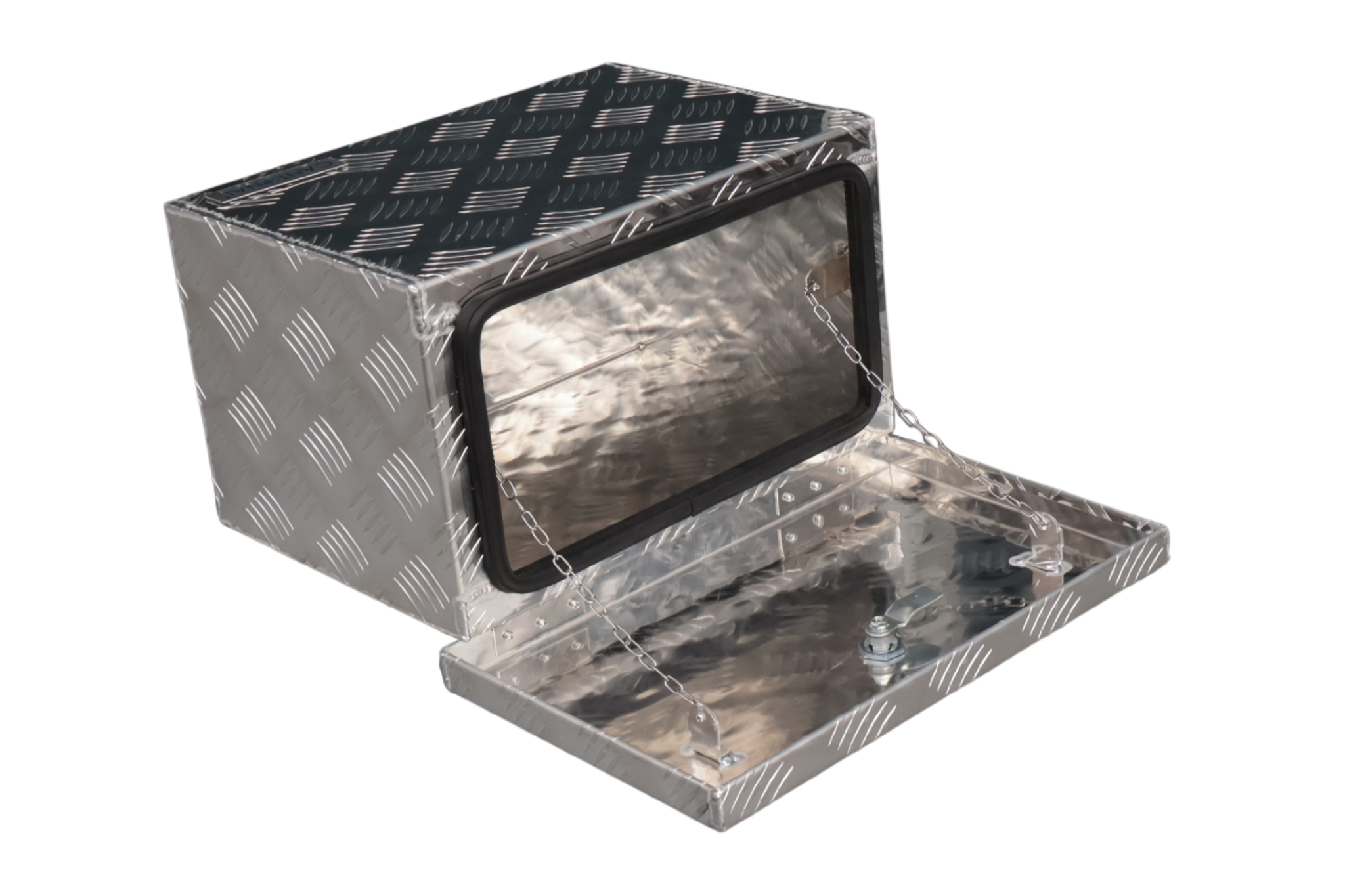 Ce coffre de timon en tôle aluminium larmée est idéal pour le transport d’outils ou de pièces détachées sur une remorque. En plus de son utilisation comme coffre de timon, il peut également servir de caisse à outils. Le coffre est équipé d’un couvercle ouvrant, muni de deux chaînes empêchant le couvercle de basculer complètement vers le bas lors de l’ouverture et d’être endommagé.