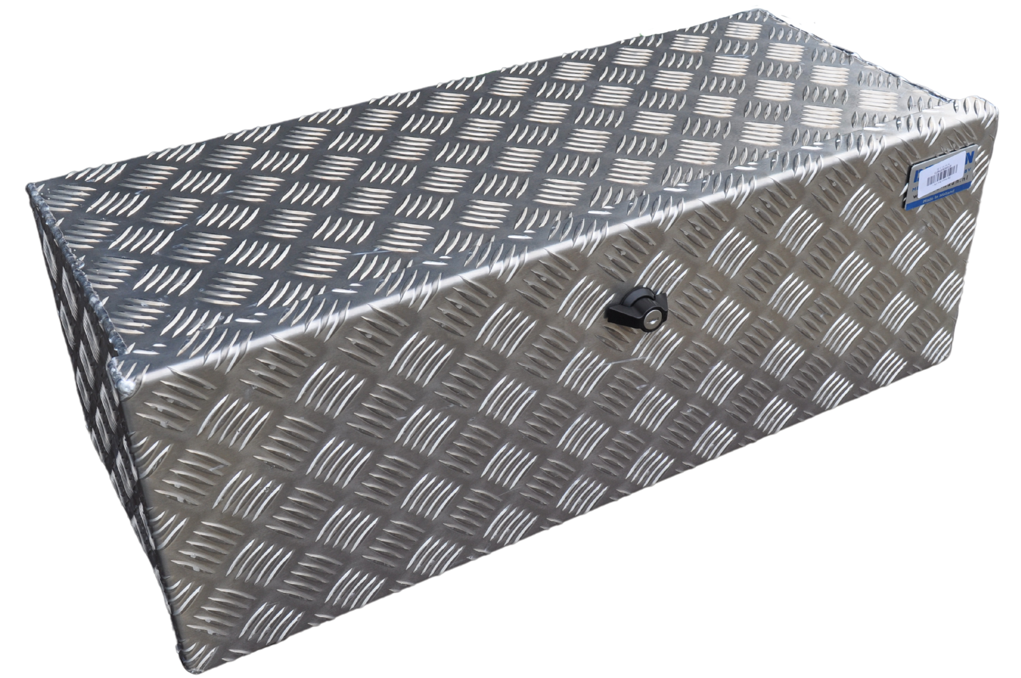 Boîte à outils pour remorque de fabrication néerlandaise en tôle striée en aluminium. Convient entre autres pour le montage sous le châssis des remorques à grande hauteur. Le Haan Box O a une épaisseur de paroi de 4 mm. Ce box est doté d'un couvercle ouvrable maintenu par deux chaînes afin qu'il ne pende pas complètement et ne soit pas endommagé lors de l'ouverture. Un joint en caoutchouc est placé sur le bord de la boîte, de sorte que le contenu reste à l'abri de l'eau et de la poussière (IP55). La Haan Box O pèse 7,3 kg et a une capacité de 60 litres. En combinaison avec la serrure papillon, la boîte de tirage est étanche aux éclaboussures et à la pluie.