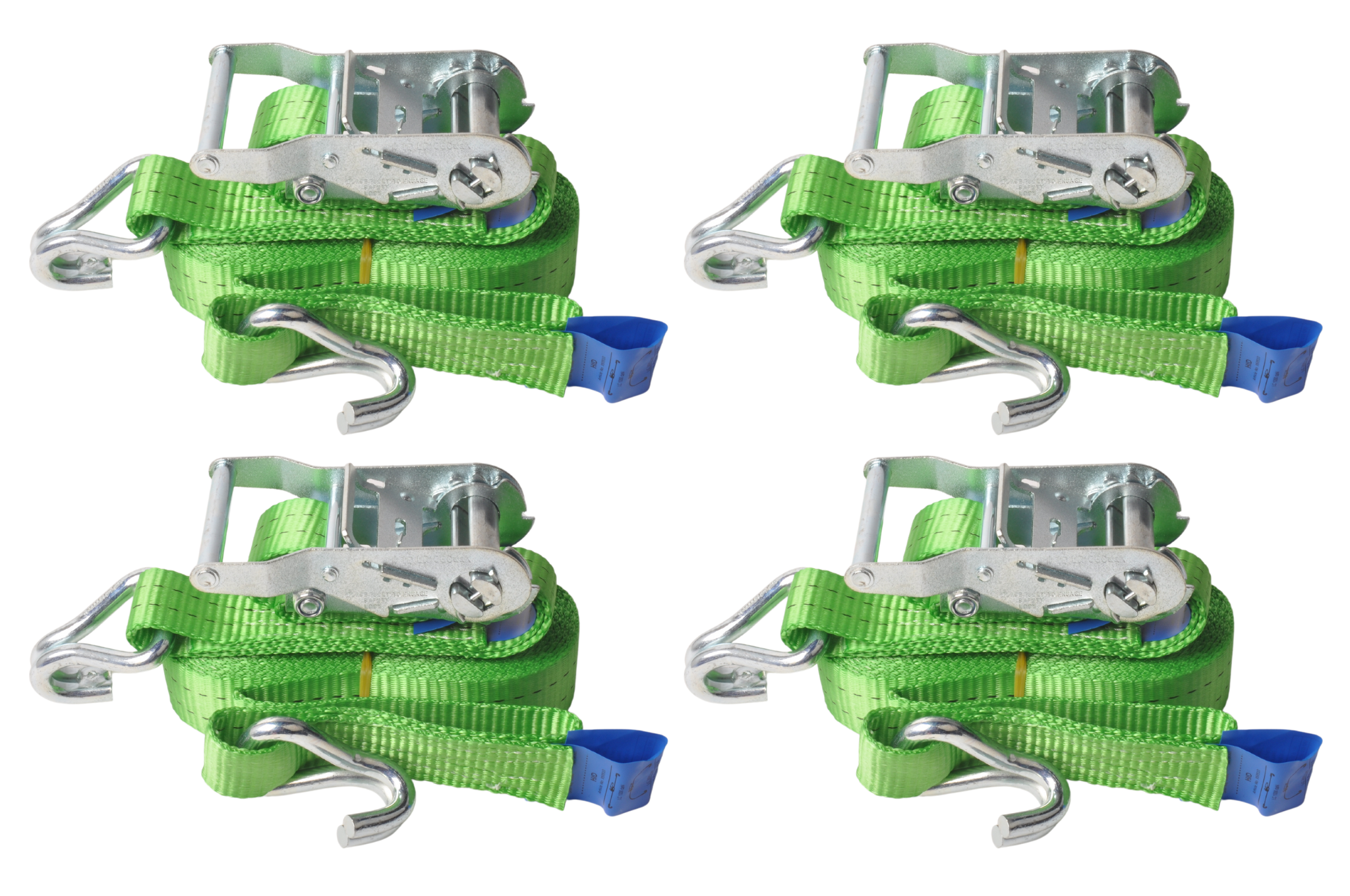 Ce jeu de quatre sangles d'arrimage vertes de 6 mètres avec une charge de rupture maximale de 2000 kg est livré en standard avec des crochets libres et des cliquets.