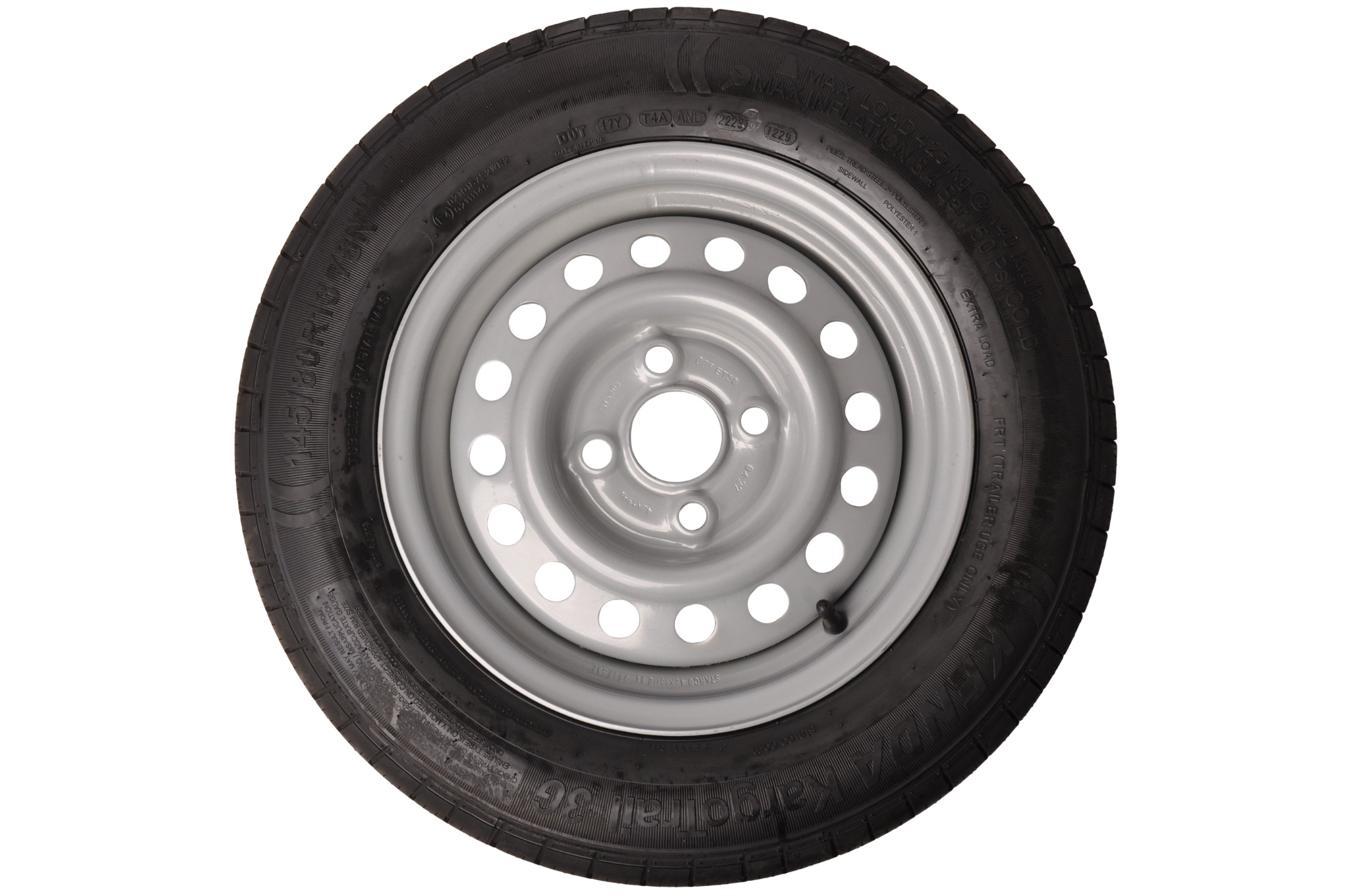 Cette roue de remorque complète de 13 pouces avec la taille de pneu 145/80 a une capacité de charge maximale de 425 kg. Le diamètre complet de cette roue est de 57,2 cm et la largeur totale est de 14,5 cm. La jante a un entraxe de 4x100 mm.