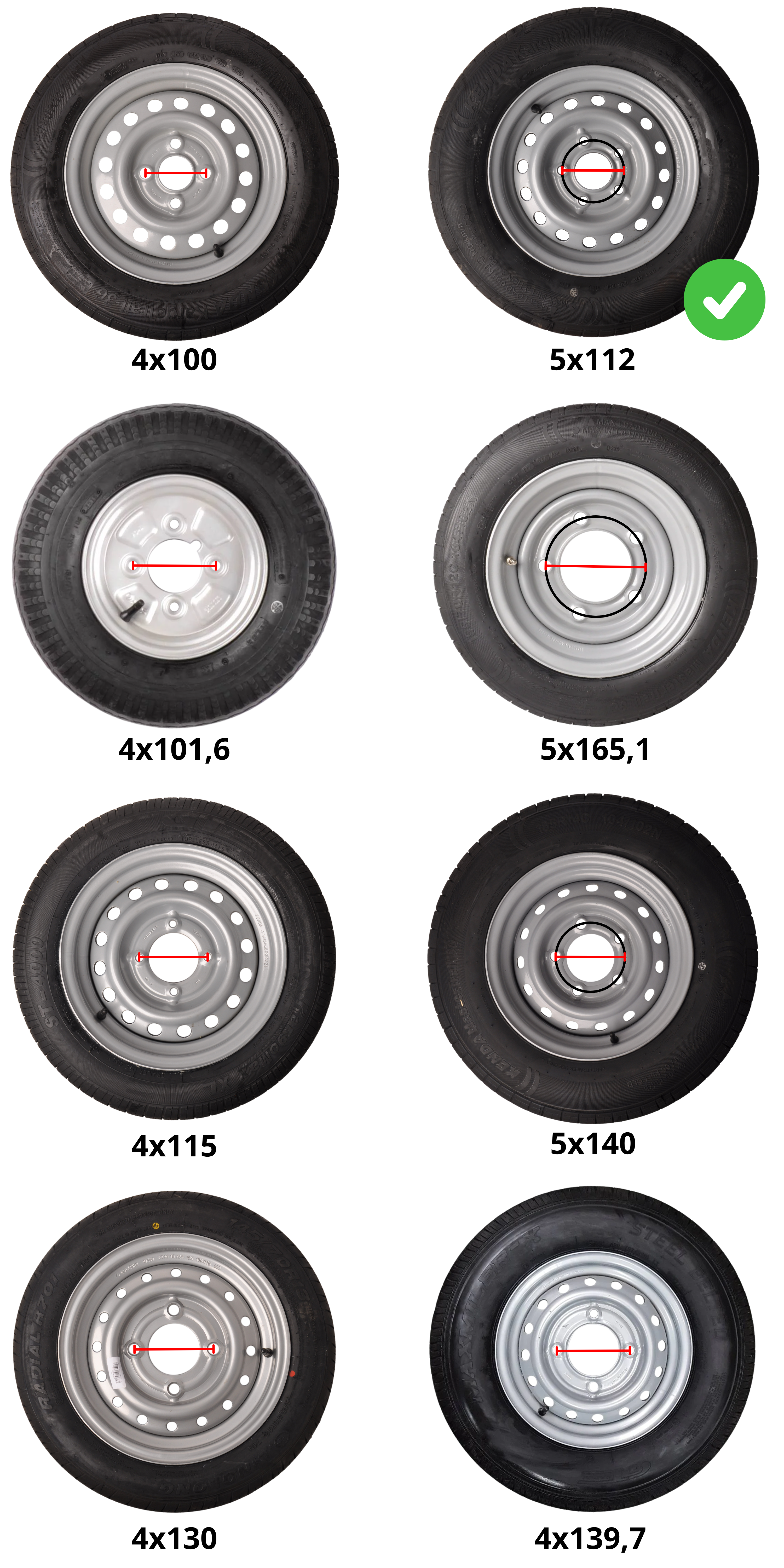 Données techniques : Roue complète de remorque - 155R13C - entraxe : 5x112 - capacité de charge : 615 kg - diamètre du moyeu : 67 mm