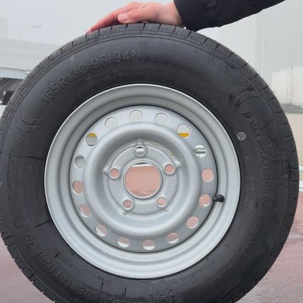 Données techniques : Roue complète de remorque - 165R13C - entraxe : 5x112 - capacité de charge : 710kg - diamètre du moyeu : 67 mm