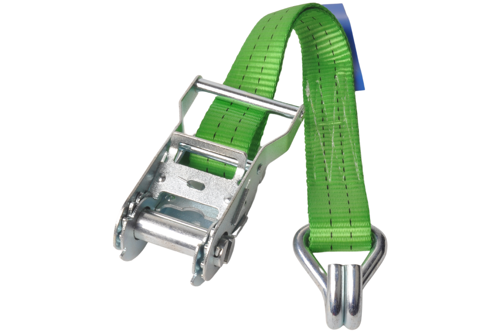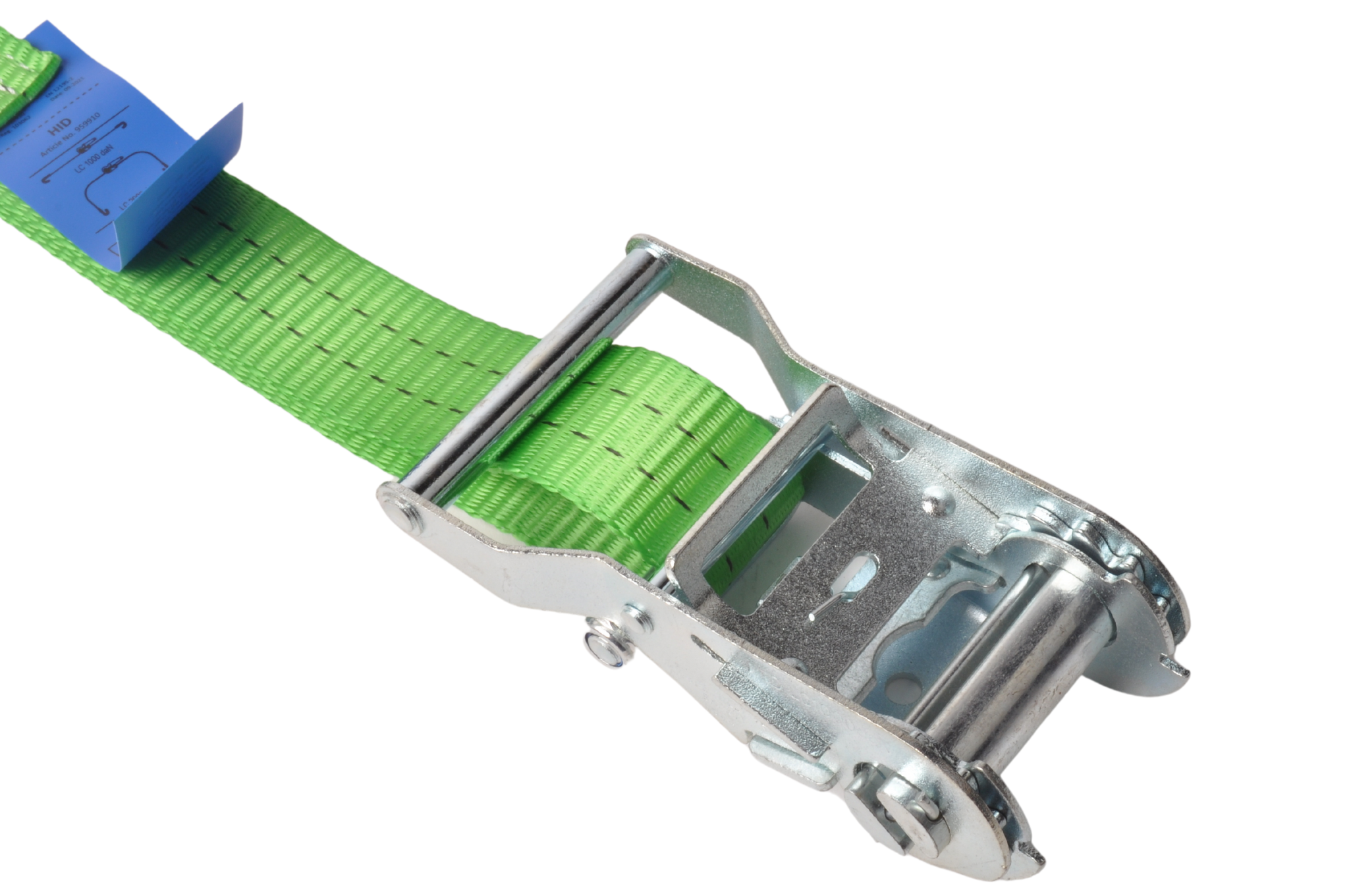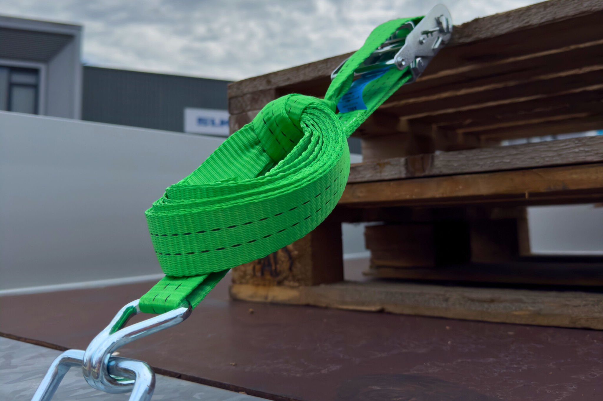 Cette sangle d'arrimage verte a une capacité de charge verticale allant jusqu'à 1000kg et une traction totale allant jusqu'à 2000kg. Cette sangle d'arrimage est livrée avec un crochet libre et un cliquet.